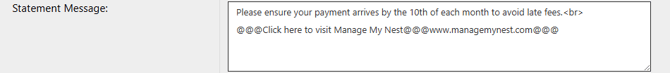 Sometimes, you may want to display important reminders or notices on resident statements, such as "Please ensure your payments arrive by the 10th of each month to avoid late fees." This guide explains how to add a message and include an embedded link if needed.